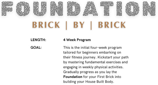 This is the initial four-week program tailored for beginners embarking on their fitness journey. Kickstart your path by mastering fundamental exercises and engaging in weekly physical activities. Gradually progress as you lay the foundation for your First Brick into building your House Built Body.